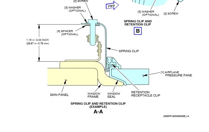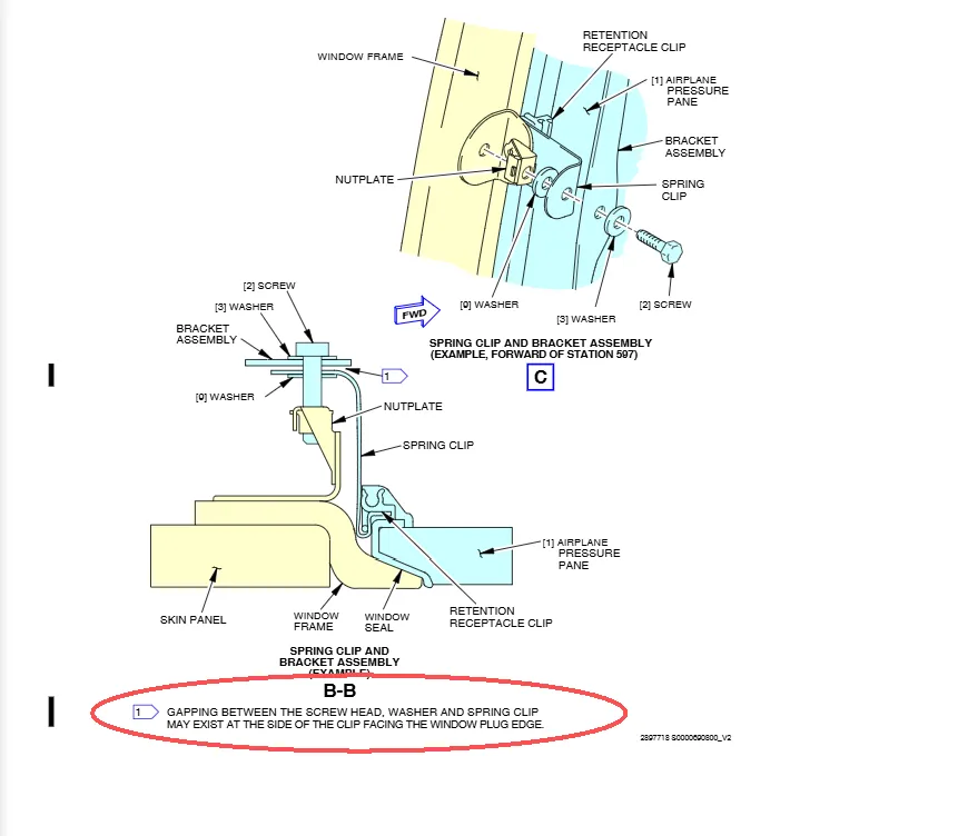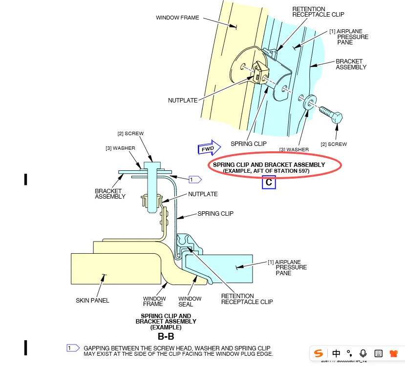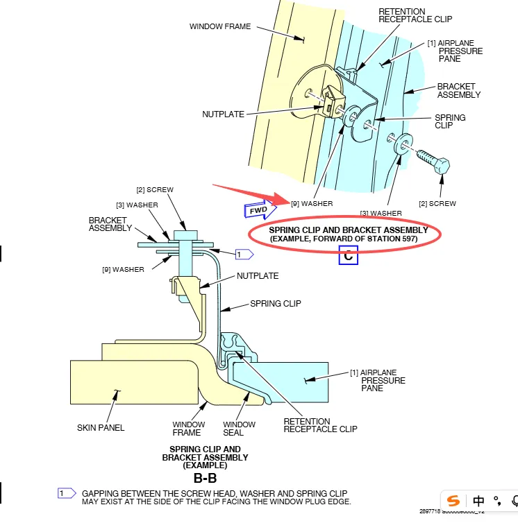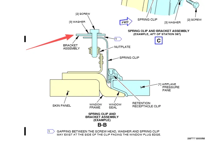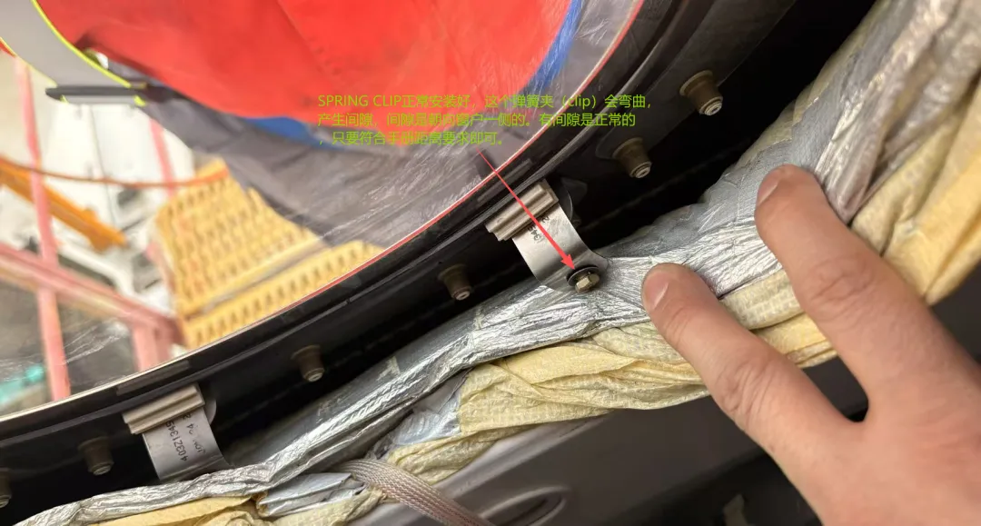 SPRING CLIP正常安装好,在螺帽,垫片和弹簧夹之间会产生间隙(如图),间隙的产生方向是朝向窗户一侧的。这个就是注释说的内容,螺钉安装好有间隙是正常的,不要被此现象迷惑,惯性认为是不正确安装。针对LINE 210之后的飞机(787-9),只要确认距离符合要求即可Make sure that the distance between the back edge of the clips and the inboard surface of the window frame is 1.18 ±0.03 in. (29.97 ±0.76 mm)。