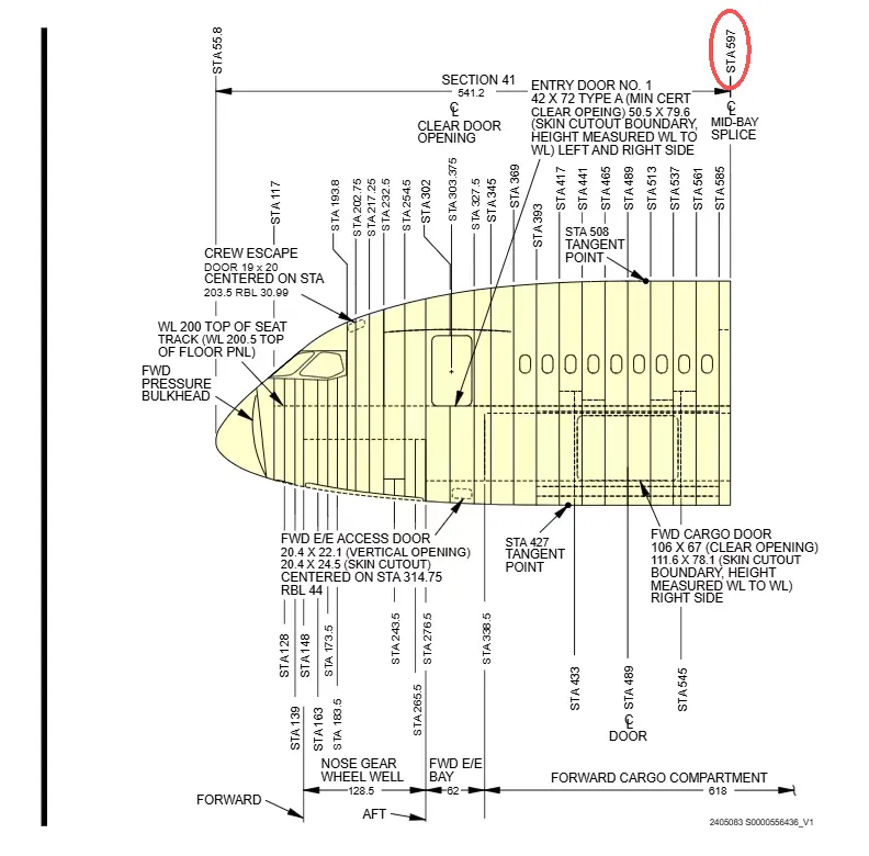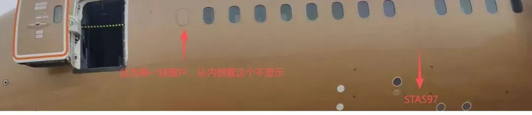 站位597如何确认,一般我们会数窗户位置,这个窗户必须是从外面数来确认,从外面数第9个窗户是STA 597分界线。如下图。第一个窗户从内侧看是装饰板,从内侧数一定要把这个窗户算上才是正确站位。