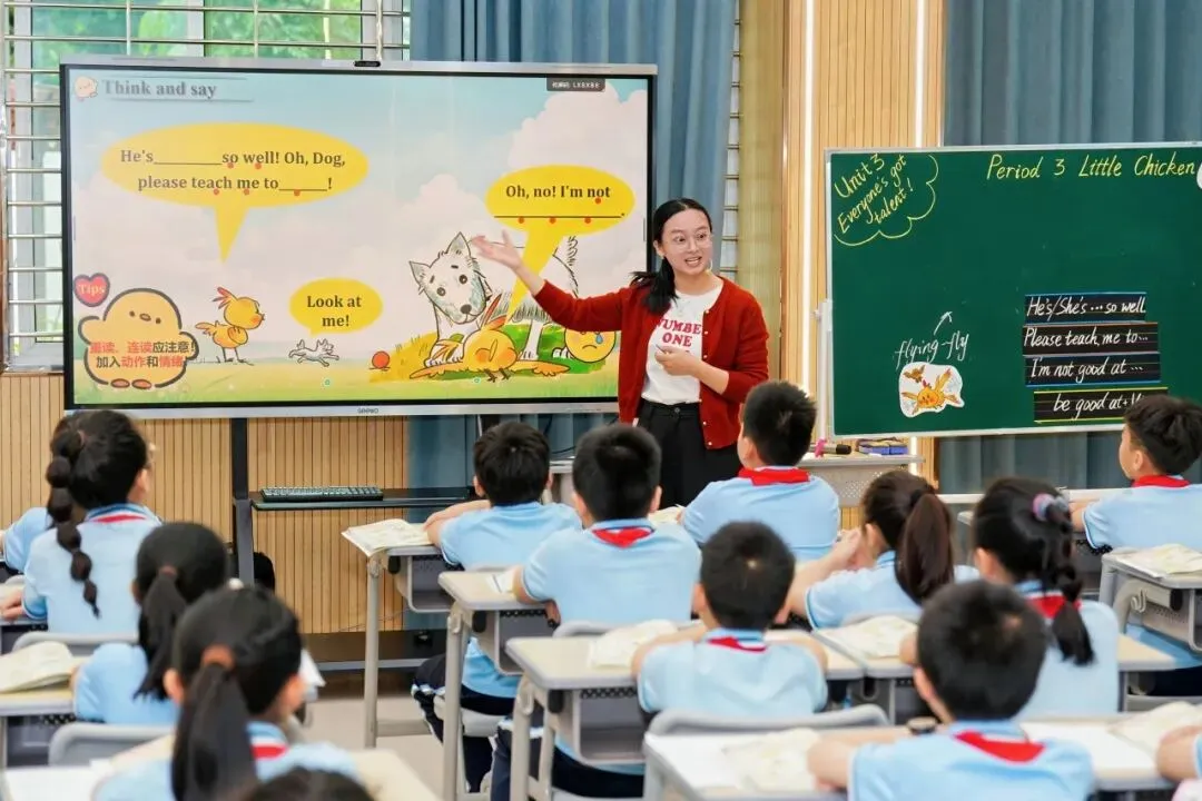 泉州市小学英语吕月云工作室核心成员、泉州市丰泽区第三实验小学的黄佳丽老师执教Little Chicken,课堂遵循 “读前激活 — 读中沉浸 — 读后升华”路径,借助 AI 创设情境、即时反馈,让学生在 “小鸡寻找特长” 的故事中掌握核心句型与语法,在体验中树立“人各有所长”的自信品格,实现语言学习与生命教育有机融合。