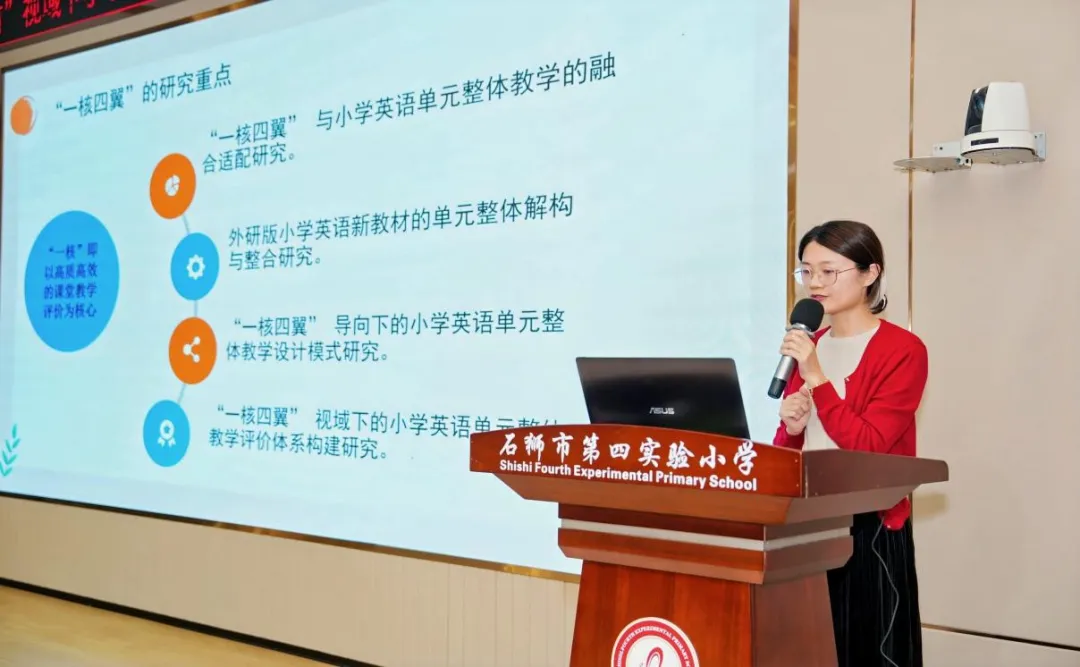 泉州市小学英语吕月云名师工作室的核心成员、泉港区庄重文实验小学的庄筠老师以《“一核四翼” 视域下的小学英语单元整体教学设计与实践研究》为题,系统阐释“一核四翼”评价体系,解读AI赋能单元整体教学路径,推动教学评一体化,聚焦四大核心素养,提供可操作教学范式。