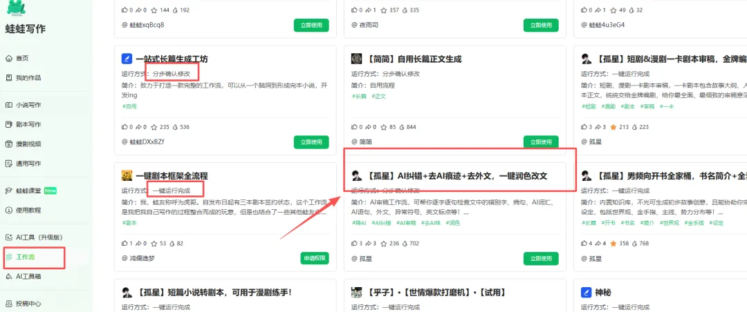 蛙蛙写作的工作流功能也很实用,能串联起小说创作的各个步骤,一键运行即可推进全流程创作。搭配续写正文、续写情节等工具,能大幅提升创作效率。