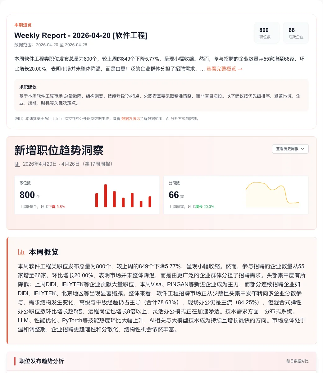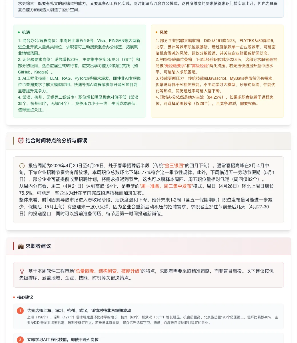 数据来源:基于2026.04.20-04.26软件工程职位类别的招聘周报分析。