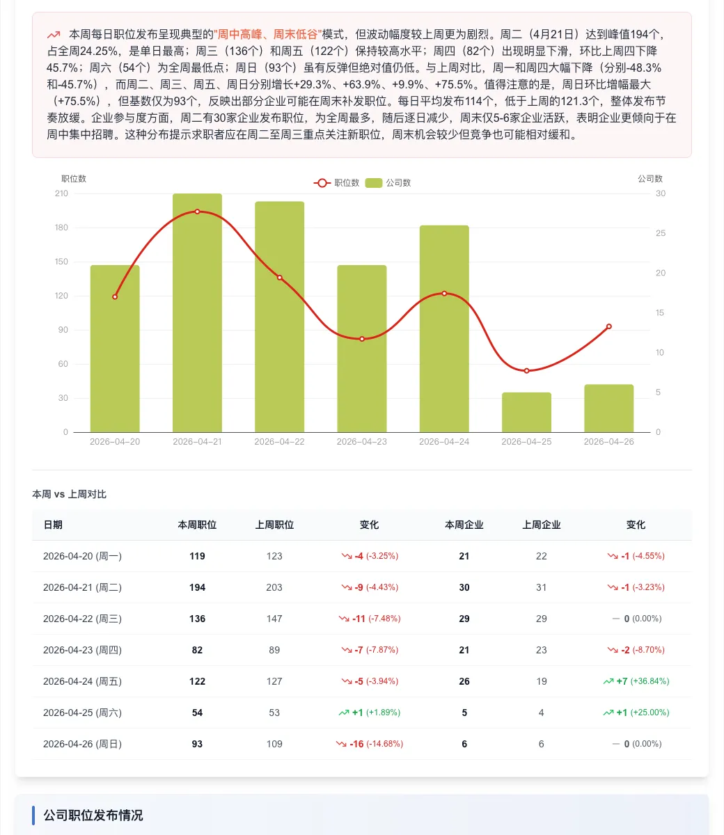 本周职位发布呈典型“周中高、周末低”节奏: