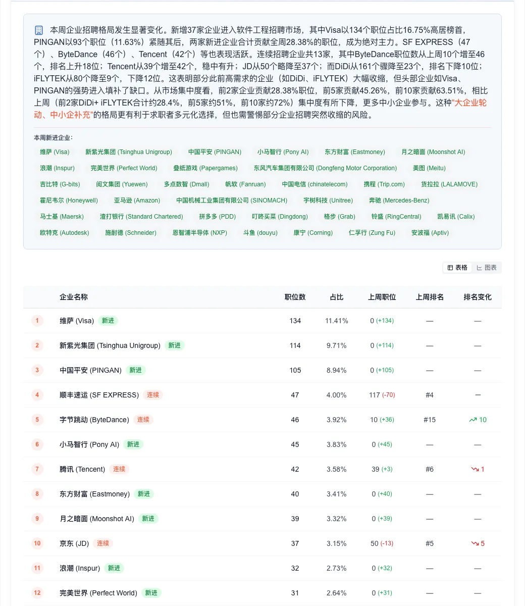 新进企业37家,其中Visa(134个)、PINGAN(93个)两家合计贡献全周28.4%的职位 -