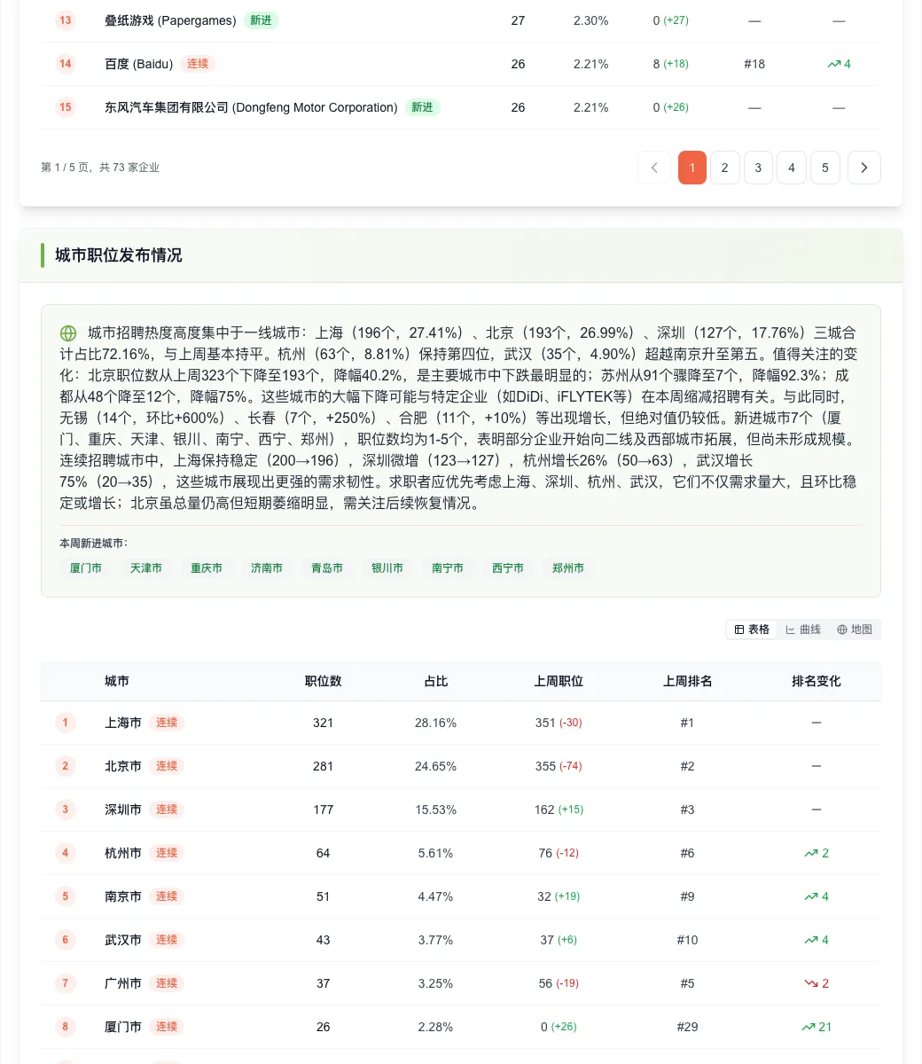 :前2家占比28.4%(与上周DiDi+iFLYTEK相当),但前5家占比45.3%(上周约51%),前10家占比63.5%(上周约72%)。更多中小企业参与,求职者选择面更宽。
