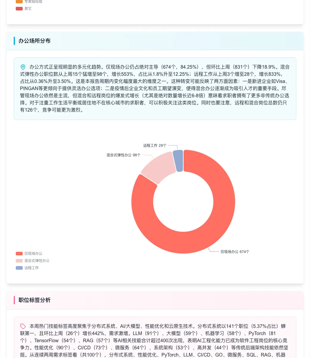 这是本周变化幅度最大的维度。混合+远程岗位合计从18个增至126个,占比从2.2%升至15.8%。