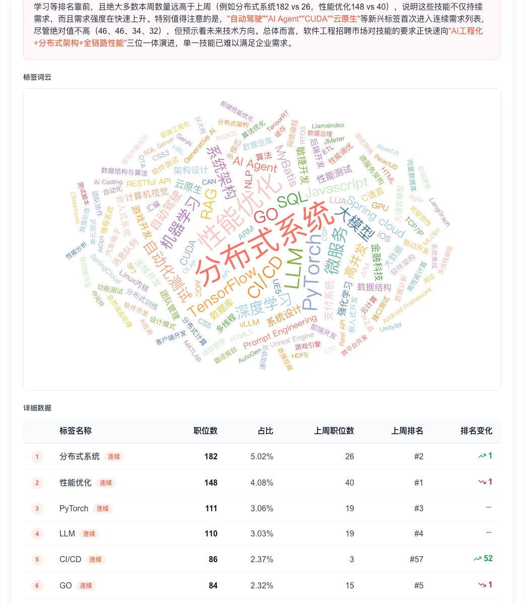 连续两周都需求的核心技能(共100个) 中,AI相关技能(LLM、大模型、PyTorch、RAG、机器学习、深度学习)增速远超传统技能。此外,“自动驾驶”“AI Agent”“CUDA”“云原生”等新兴标签首次进入连续需求列表。