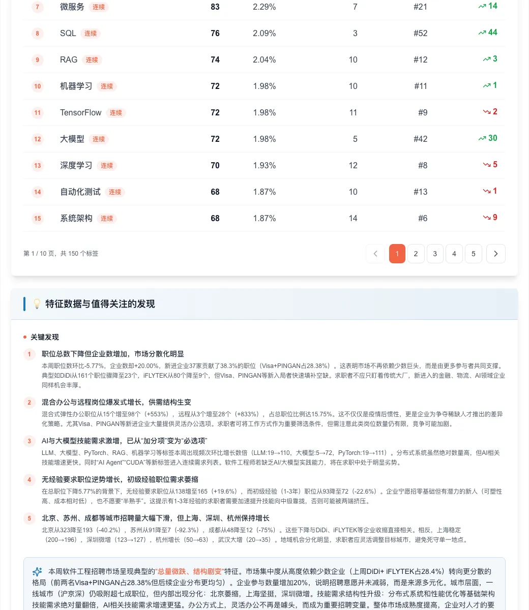 总量微降,结构剧变:软件工程职位数环比-5.77%,但企业数+20%,Visa、PINGAN等新进企业贡献近三成岗位。AI技能需求爆发:LLM、大模型、PyTorch等标签出现频次环比增长300%-1400%,分布式系统+AI工程化成为标配。灵活办公崛起:混合/远程岗位激增5.5-8.3倍,占比从2.2%升至15.8%。地域分化加剧:北京、苏州、成都招聘量大幅下滑;上海、深圳平稳,杭州、武汉快速增长。经验要求“两头热、中间冷”:无经验岗位+19.6%,初级经验岗位-22.6%。求职者应迅速补充AI技能,关注新进企业,把握节前投递窗口。