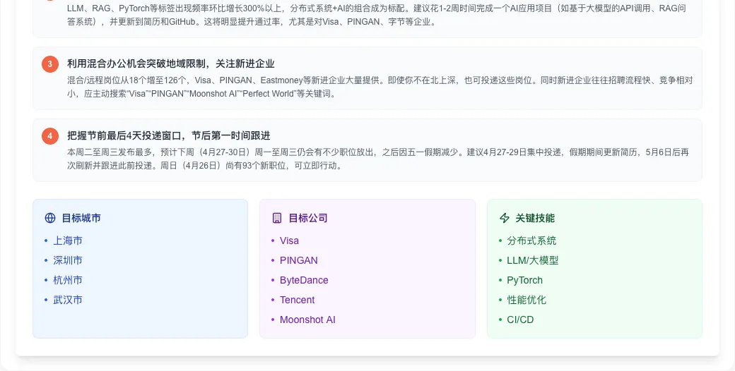 5月上旬(假期结束后)有望迎来一波反弹,企业会集中释放积压岗位 - 建议在4月27-29日完成投递