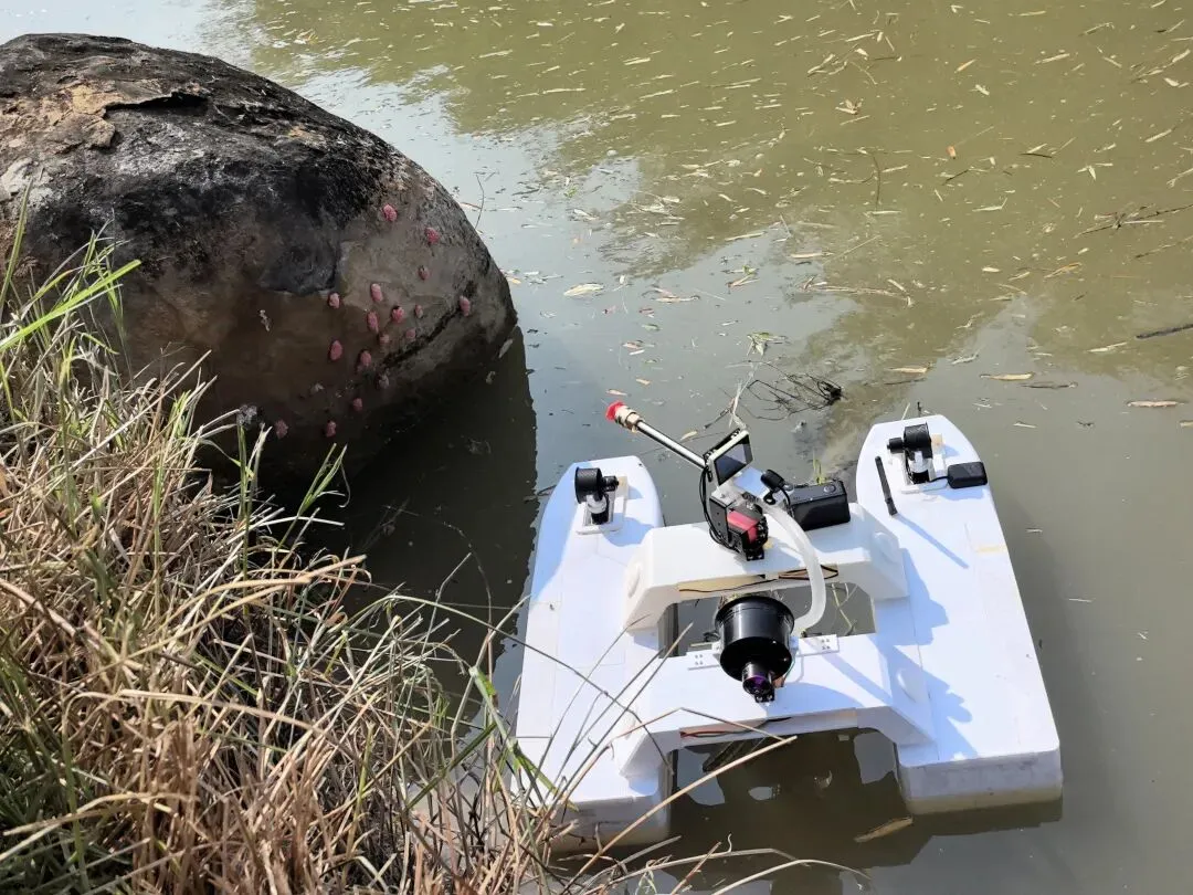 针对福寿螺在岸壁产卵的习性,水上除卵机器人通过AI图像识别技术,在定位卵块识别确认目标后“火力全开”:配备的高压水枪、营养盐杀卵剂、激光等多种功能模块,要么冲碎卵块,要么精准喷洒杀卵剂,要么用激光彻底消杀,消灭螺卵,不给“螺宝宝”留机会。
