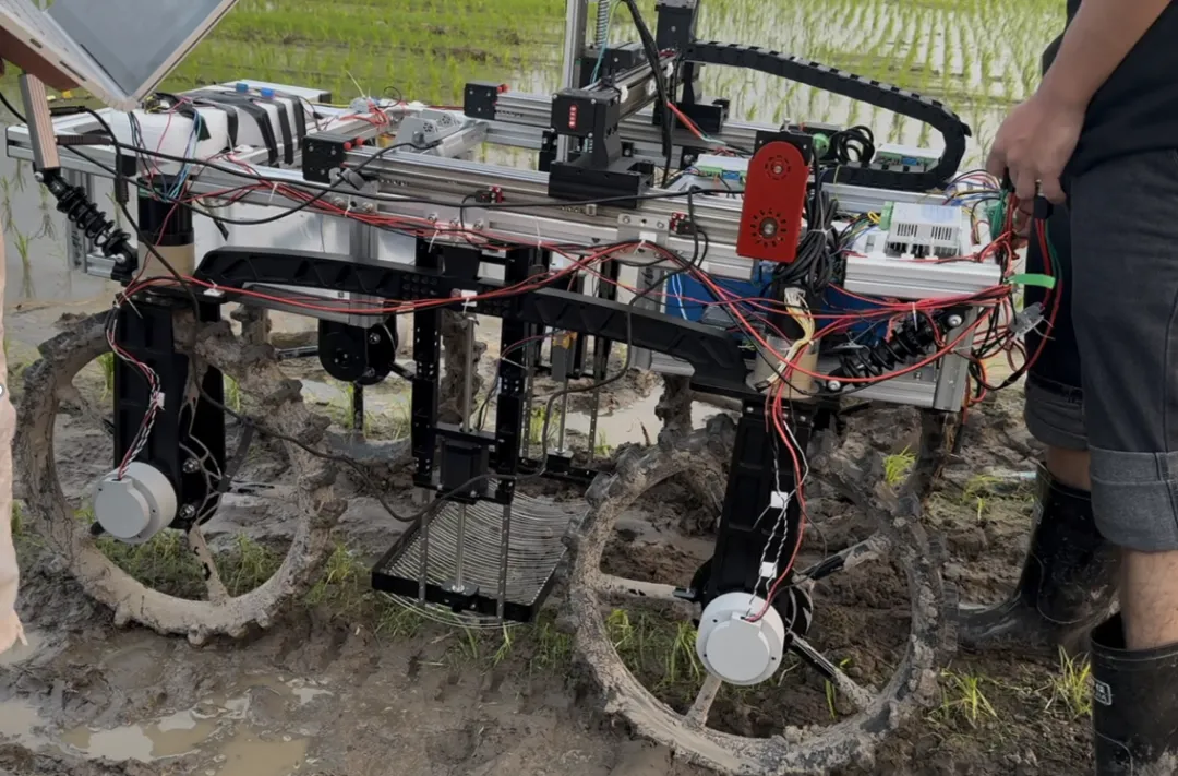 该设备采用分布式处理方式,其底部轮形弹性钢丝网的设计十分巧妙,类似网球捡拾器,能通过挤压的方式先将福寿螺从田里收集上来,随后再经过图像识别环节,由机械臂进行精准筛选。