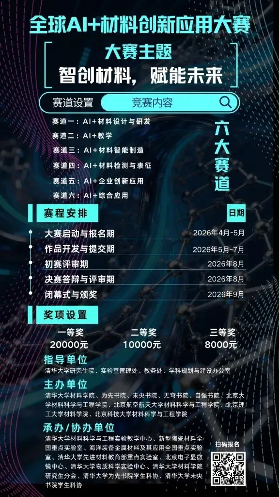 为紧密围绕国家“人工智能+”行动战略,瞄准新材料研发与产业变革的前沿趋势,“全球AI+材料创新应用大赛”现已面向全球正式开启报名通道 !