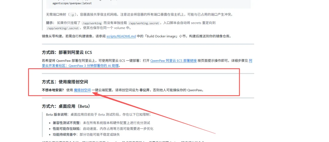 找到Qwenpaw的Github仓库,然后看文档,往下来,看到这个内容,就点进去。