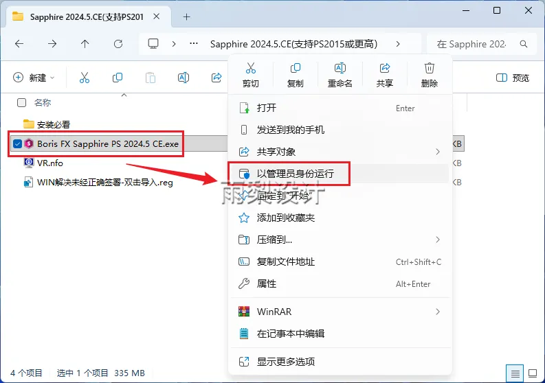 2.右键【Boris FX Sapphire PS 2024.5 CE.exe】选择【以管理员身份运行】