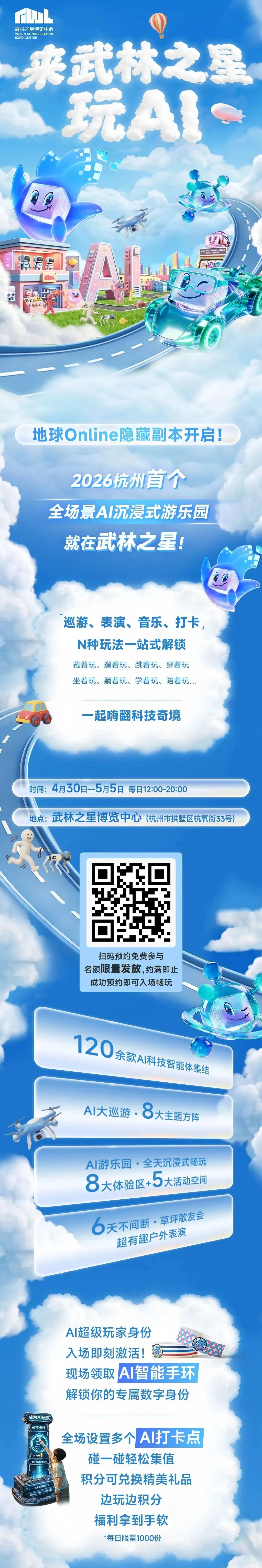 “五一”来武林之星玩AI!N种玩法,畅玩整天不重样! 去年武林之星博览中心的AI机器人酷玩乐园,不少大小朋友都直呼没玩够。 今年,“来武林之星玩AI”带着更多好玩的黑科技、更多精彩的活动来了! -THE END- 杭州文广旅游发布整理编辑 来源:武林之星博览中心 版权归原作者所有 转载请注明出处(visithangzhou) 以诚相待,不负相逢|杭州连续17年入选全国游客满意十佳城市 四月杭州,花事正浓!这些地方的春色正惊艳 速存→你想要的春日壁纸来啦!