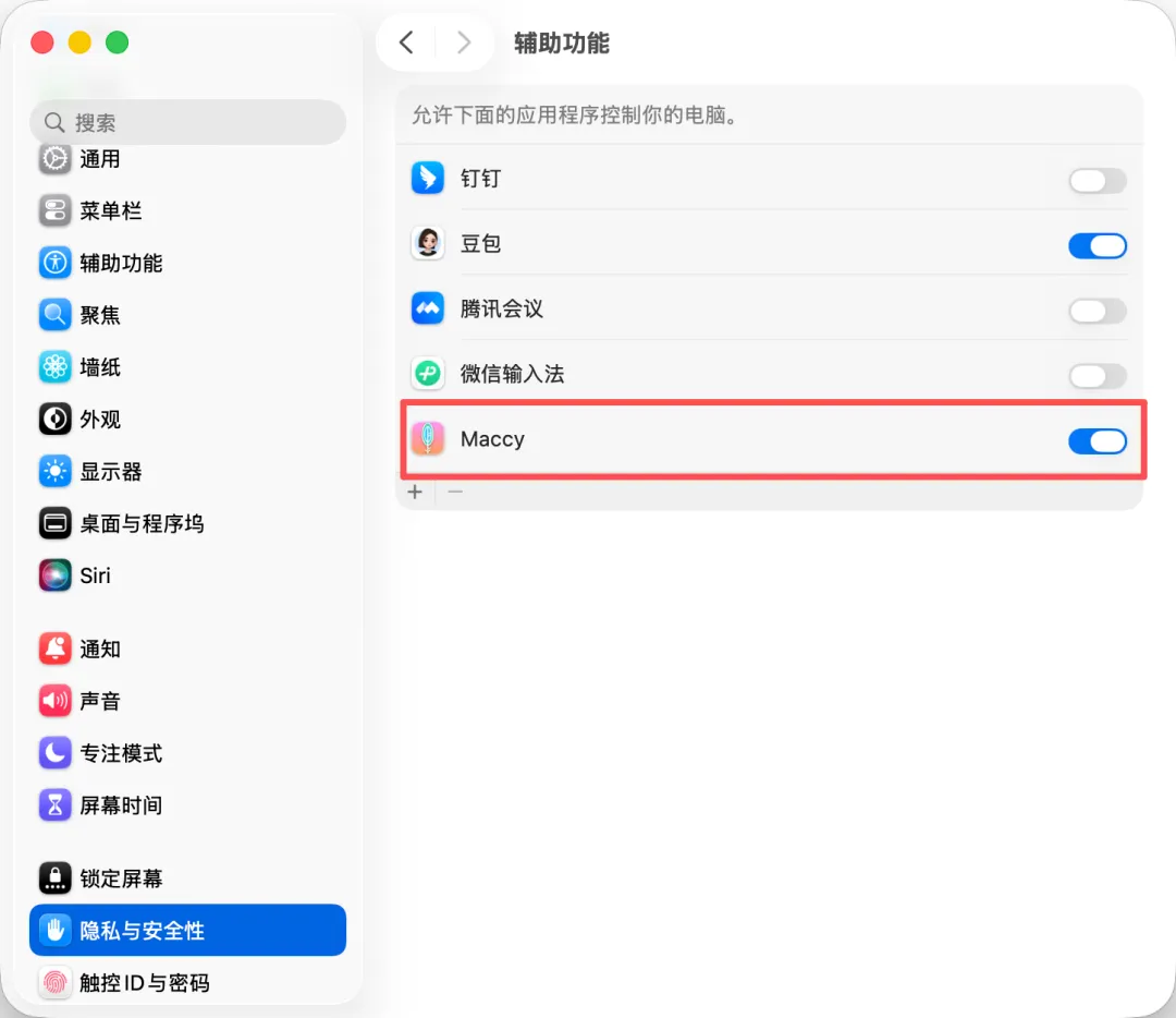 意思是需要开个权限,中文路径是:系统设置 -> 隐私与安全性 -> 辅助功能: