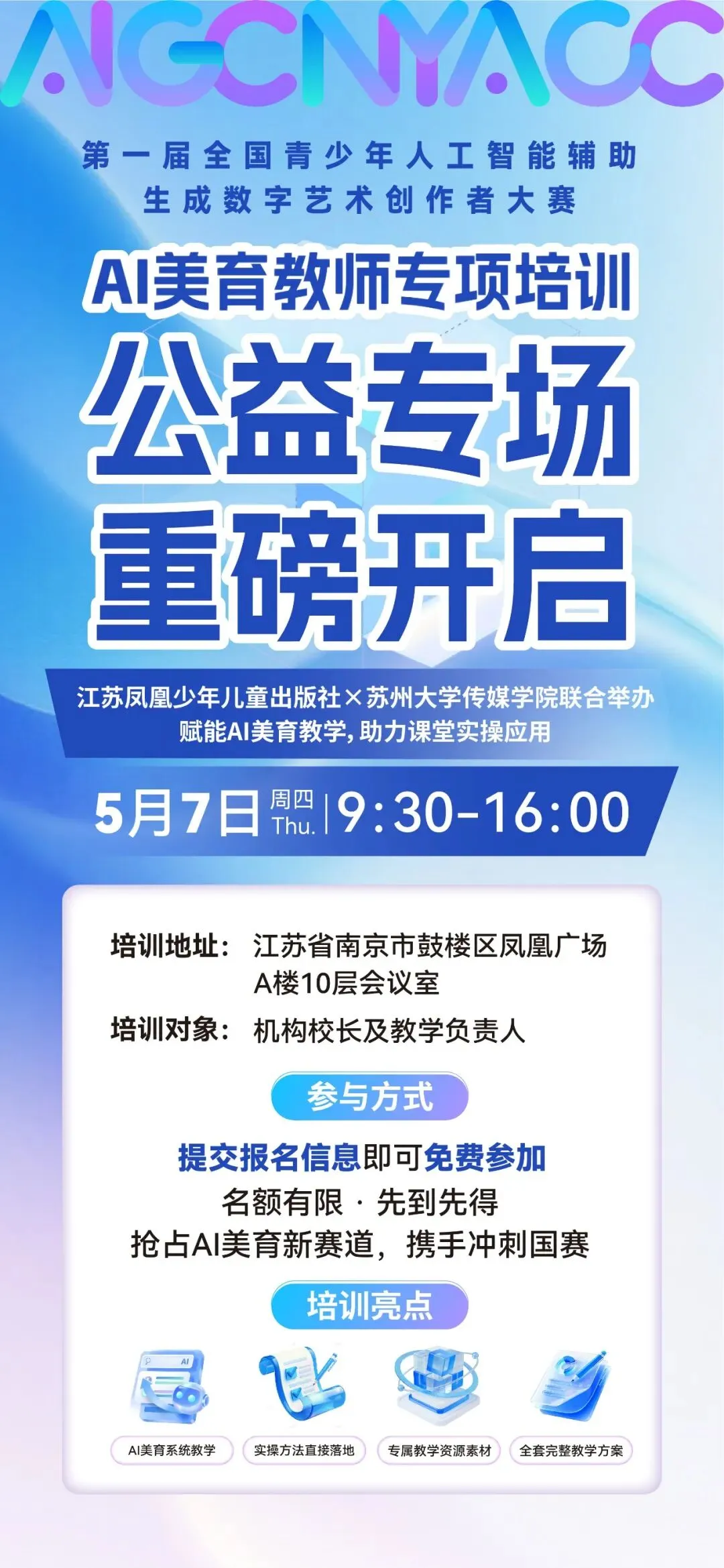 活动通知|关于“AI+美育”教师专项培训活动的通知 · 公益专场 · 江苏凤凰少年儿童出版社*苏州大学传媒学院*赛事江苏省组织单位联合举办