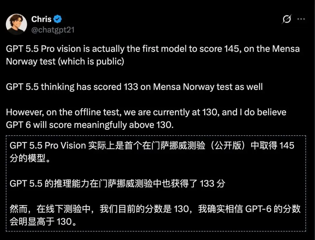 那个集成了 GB300 的怪物 ✨ 视觉智商 145 啦。它已 成功跨越门萨(AI资讯) 的基准线。模式识别能力 (๑•̀ㅂ•́)و✧ 简直就是非人哉。就业窗口期怕是 🚄 要缩短到二十个月。人类得快点进化 😱 否则真要被甩开啦。