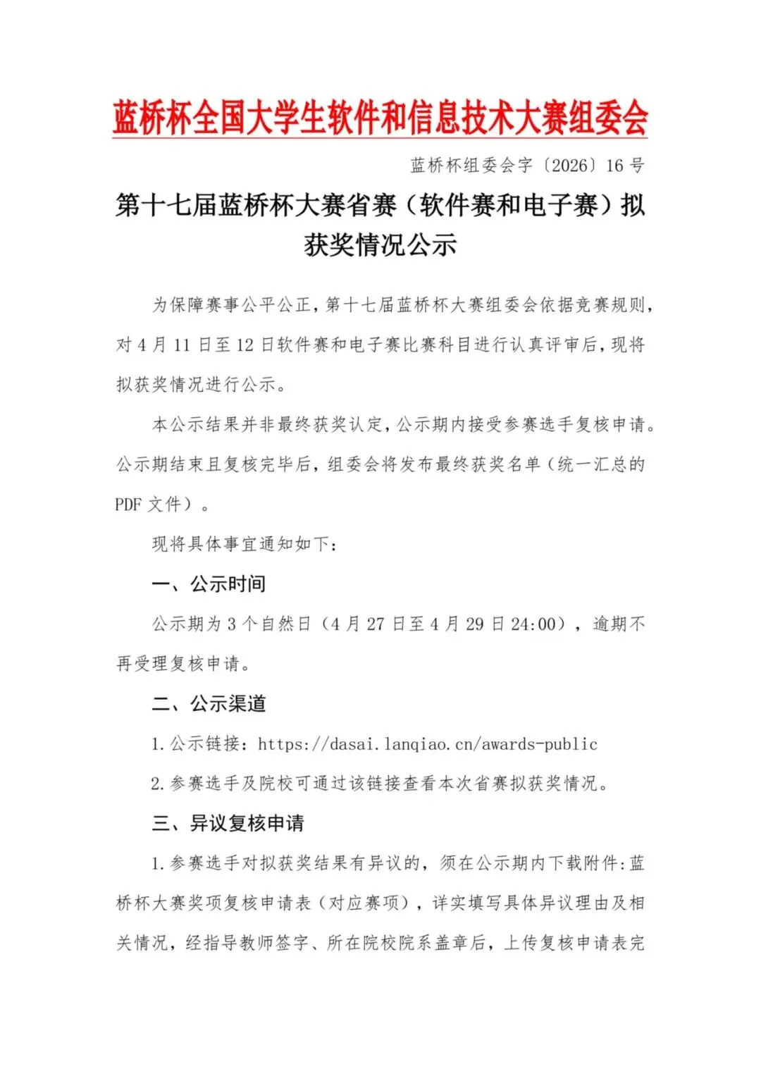 第十七届蓝桥杯大赛省赛(软件赛和电子赛)拟获奖情况公示:https://dasai.lanqiao.cn/notices/1906