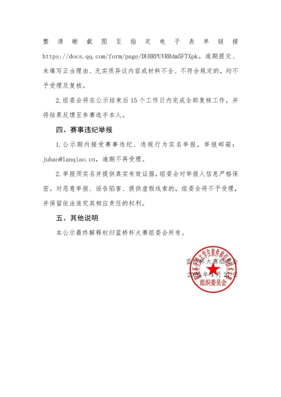 1.公示期内接受赛事违纪、违规行为实名举报,举报邮箱:jubao@lanqiao.cn,逾期不再受理。
