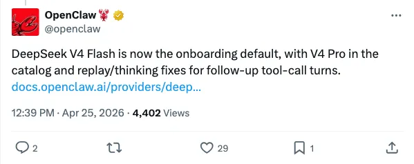 按官方更新说明和随后补充的 release 看,若你准备接入 DeepSeek,先补齐 DEEPSEEK_API_KEY,再重新跑一次 onboard,默认模型已指向 deepseek-v4-flash,别拿旧 provider 配置硬顶。