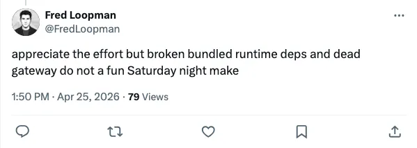 使用者反馈提到启动更快、语音和会议代理更容易上手,但也有开发者抱怨 bundled runtime 依赖和 gateway 偶发掉链子,所以最好补一轮真实场景回归:启动、模型枚举、工具调用,各跑一遍。