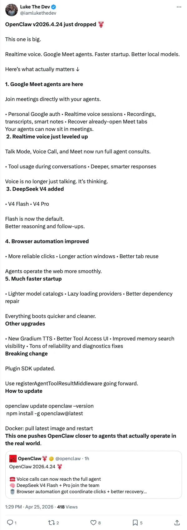 更新范围也比表面更大。公开讨论里,使用者把它概括成实时语音、Google Meet 代理、更快启动和更好的本地模型支持;