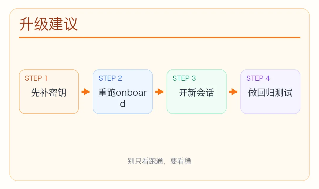 如果你正维护长期任务,升级后先开新会话,比直接续跑更稳。最后再测“体验层”而不是只看命令通过。