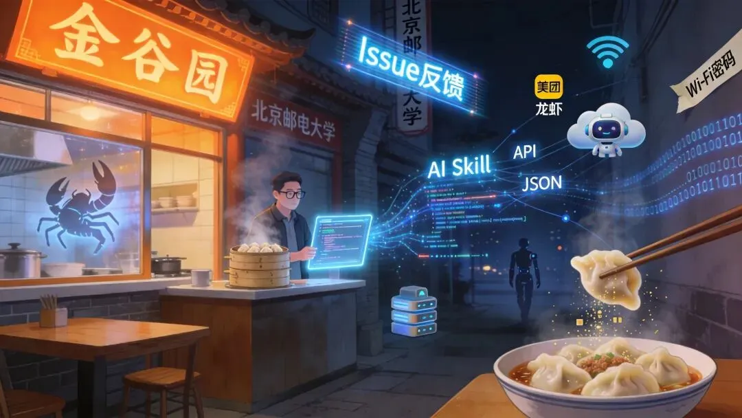 这个引发数字海啸的饺子馆,是北京邮电大学旁的“排队王”金谷园。而那个被疯狂讨论的AI Skill,功能朴素得近乎简陋:顾客通过自己的AI助手(如OpenClaw“龙虾”),可以查询门店地址、营业时间、Wi-Fi密码,甚至调用美团接口在线排队取号。