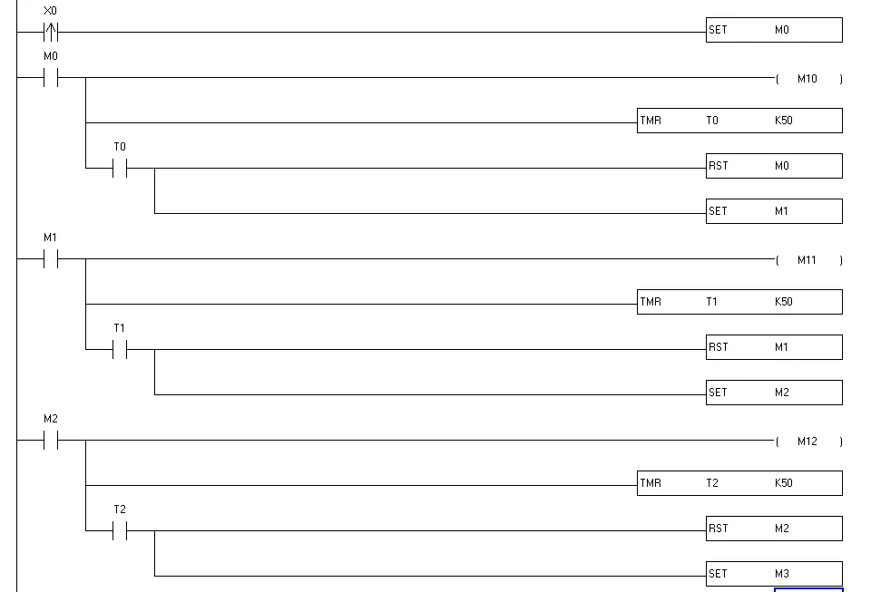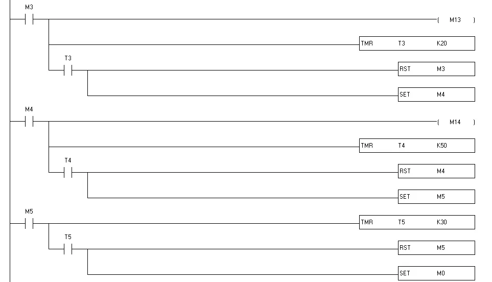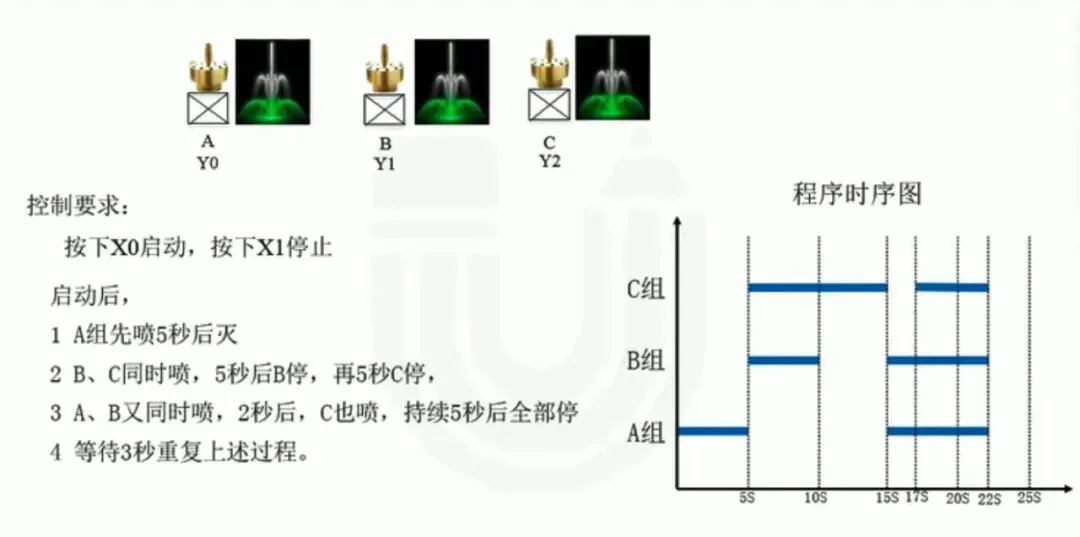 台达软件写的喷泉电路 三组喷泉控制电路: 控制要求: 按下X0启动,按下X1停止 启动后, 1 A组先喷5秒后灭 2 B、C同时喷,5秒后B停,再5秒C停,3 A、B又同时喷,2秒后,C也喷,持续5秒后全部停 4等待3秒重复上述过程。 控制电路如下: