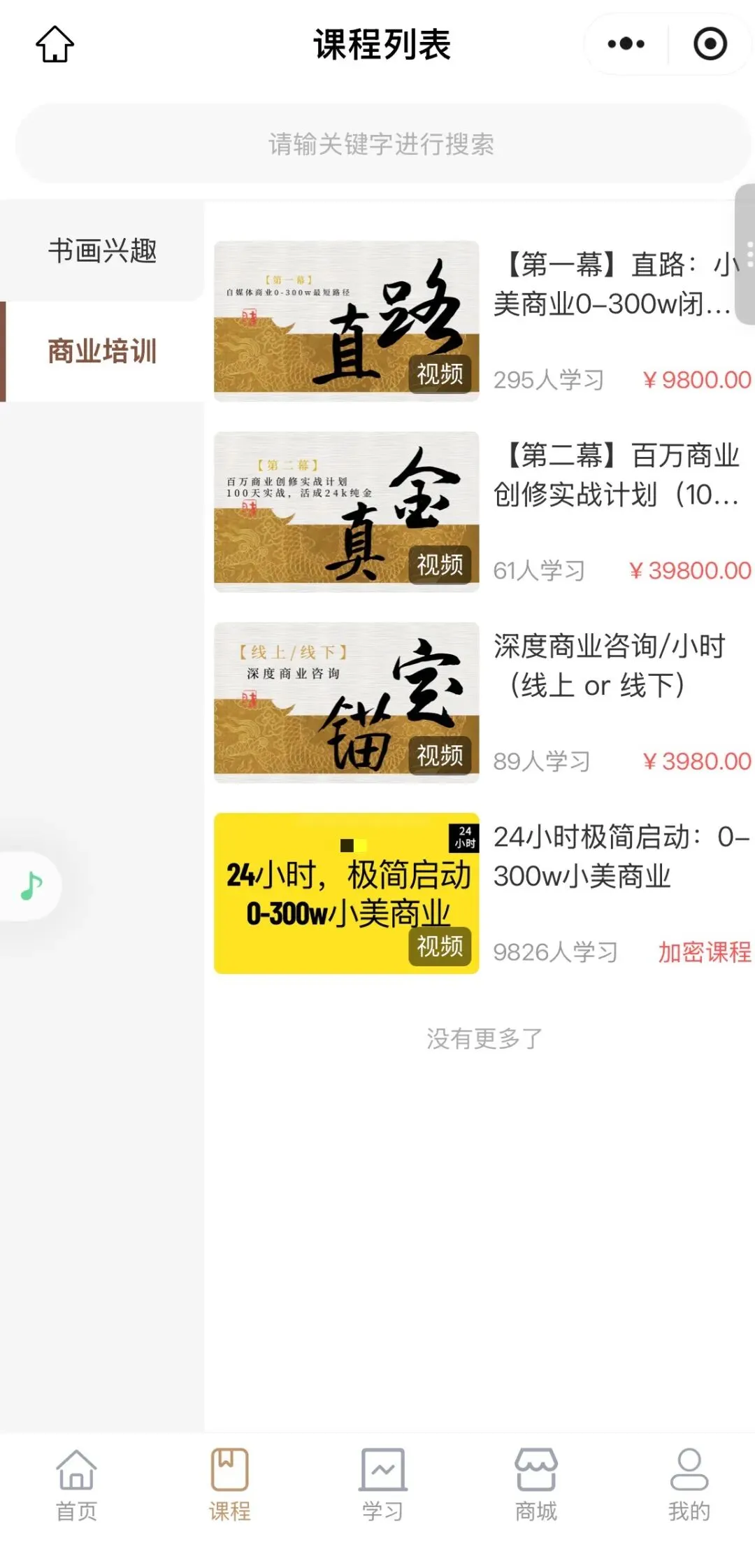支持店铺搭建,这意味着你可以把小程序做成一个完整的学习平台,而不是一个孤零零的视频播放器。