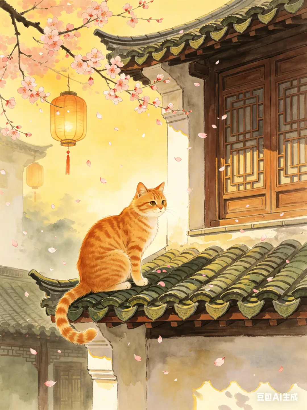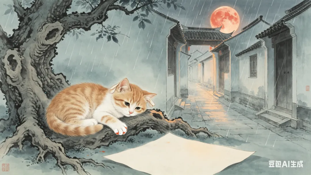 举个最直观的例子,同样是画月下猫咪,某用户写的提示词是:“3个月大的橘白英短幼猫,左前爪沾着白颜料,耳朵耷拉着怯生生蜷在老槐树根上,头靠在掉落在地的空白画纸上;背景是飘着细雨的江南巷弄,低悬的血色满月从巷口屋檐后露出半轮;俯拍中景,三分法构图,侧逆光打亮猫的轮廓,整体冷青灰色调,仅满月和猫爪颜料做暖调提亮,融合北宋工笔线条与新中式水墨晕染效果”。