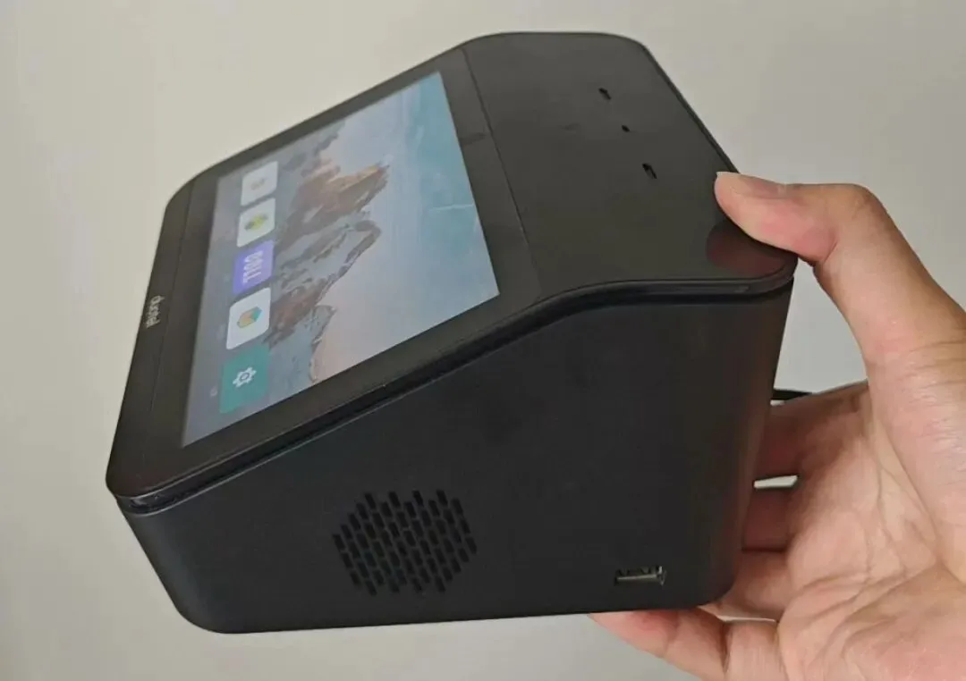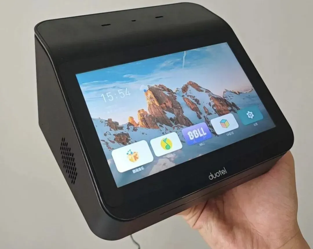 它采用了7英寸触摸屏,物理分辨率是1024×660,采用倾斜平铺的造型,左右两侧有独立扬声器,可以当智能音箱去玩。