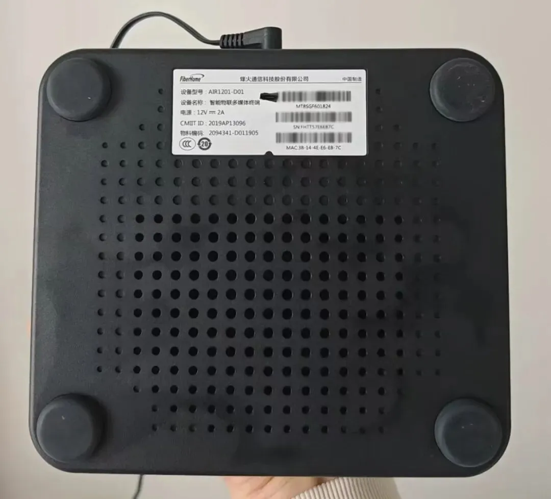 它底部是大面积散热孔,电源口在屁股上,需要12V/2A的电源。铭牌上印着的厂商是烽火通信,怪不得不讲武德关服了,这厂商平时伺候运营商的,很多电信光猫或移动路由器都出自它家之手,酒店定制产品属于玩票性质。