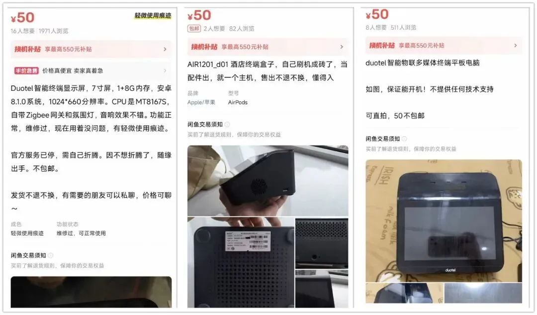 前些年我经常跑发布会,厂商会安排各地的五星级酒店,我经常能在房间内看到各类智能屏设备,既可以代替电话打前台服务,又可以声控房间内的智能设备。而今天,我在闲鱼发现了一个熟悉的老面孔。