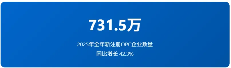 2025年全年,全国新注册OPC企业数量达731.5万户,同比增长42.3%。这意味着什么?每天有将近20000家新OPC诞生。