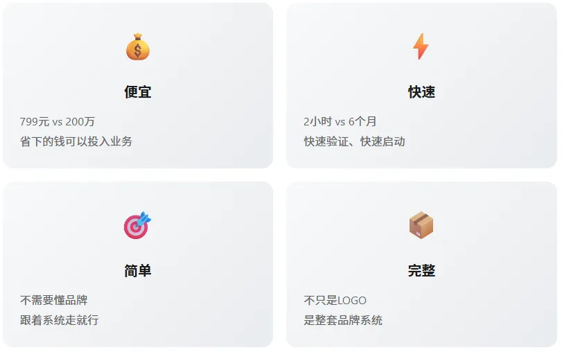 传统品牌创建的周期通常3-6个月,从调研到定位、从策略到设计,环环相扣。对于急着接单赚钱的OPC来说,时间就是生命。