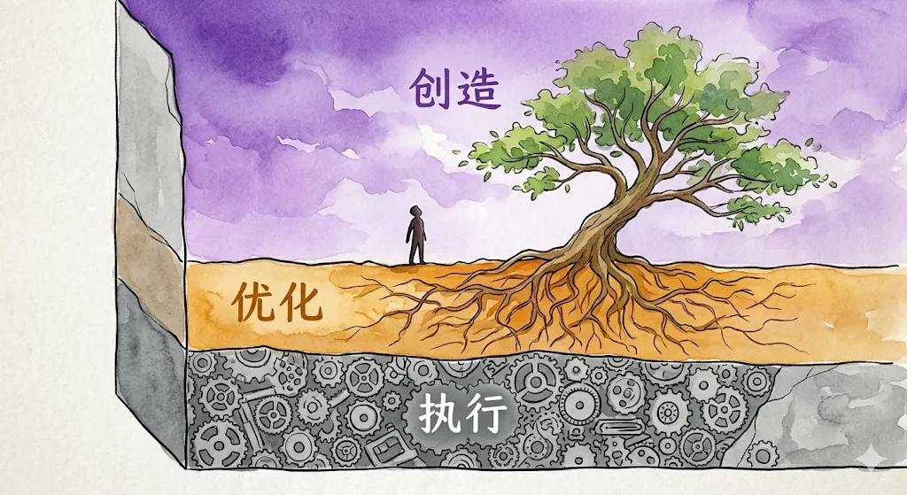 创造层——你在这个职业里创造了什么只有你能创造的东西?你的独特经历、你的直觉判断、你的存在本身带给他人的影响——这些是AI触及不到的地方。