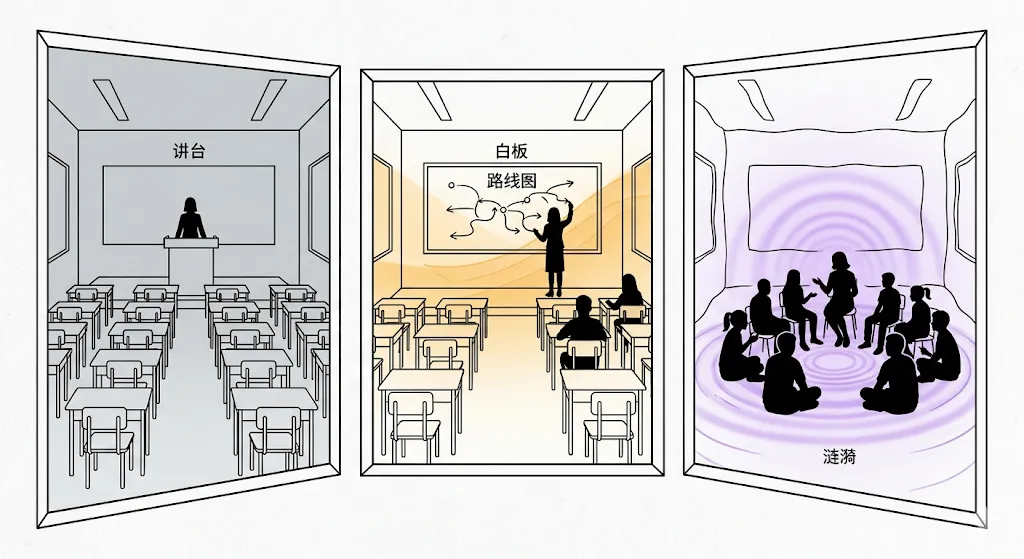 还有一种教师,她做的事很难描述。她走进教室,有些学生的眼睛就亮了。她不只是在教知识,她在用自己的存在创造一种场域——在那个场域里,一个沉默的孩子突然愿意开口了,一个觉得自己不行的孩子开始说”我再试一次”。她的工具不是PPT和教案,是她的注视、她的沉默、她在关键时刻说出的那句话。
