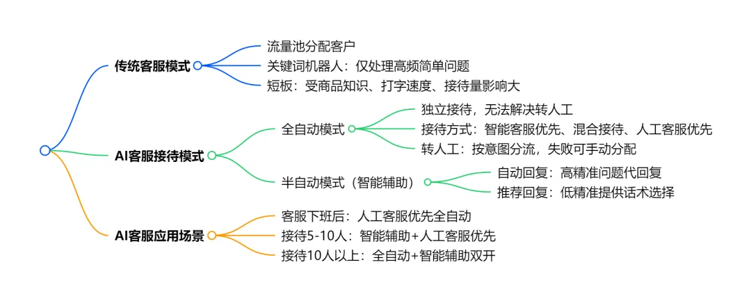 本文档先说明传统客服依赖流量池分配、关键词机器人仅能处理简单问题、回复质量与响应效率受人工因素影响大;再介绍AI 客服包含全自动与半自动(智能辅助)两种核心接待模式,明确各自运行逻辑、接待方式与适用场景,同时给出不同客服接待人数、工作时段下的AI 客服推荐使用方案。
