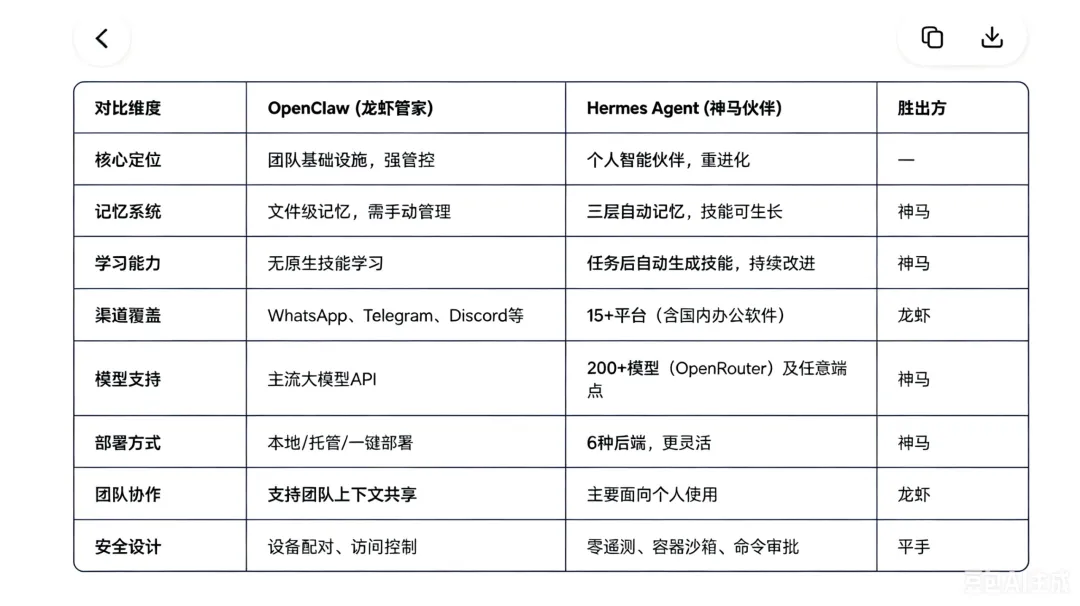 而 Hermes Agent 则代表了个性化、进化型的AI伙伴路线,它相信AI应该像伙伴一样成长,与你共同积累经验、适应你的独特需求,是真正的“个人神驹”。