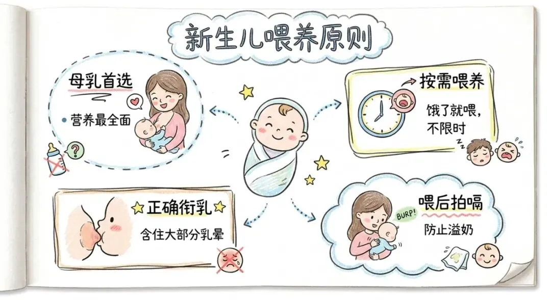 这张科普图清晰地展示了新生儿喂养的四大核心原则,覆盖喂养方式、喂养节奏、衔乳技巧和喂养后护理,是新手爸妈喂养路上的实用指南。下面为你逐一拆解细节和注意事项: