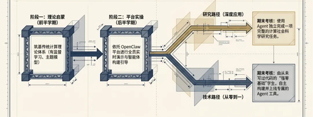 课程从设计之初就将 AI 智能体作为教学核心要素之一。随着教学推进,郑思尧将课程发展为“双轨制”:前半节讲授有监督学习、主题模型等理论方法,后半节以 OpenClaw 为平台演示并指导智能体实践。课程期末设置两条路径:研究路径(用 Agent 完成一项完整的社科研究任务)与技术路径(自主构建一个 Agent 工具),从“会用”走向“能造”。从未写过一行代码的“强零基础”学生,在学期结束时将能够独立使用甚至构建 Agent。4月14日,全班完成首次部署,45个智能体全部成功上线。
