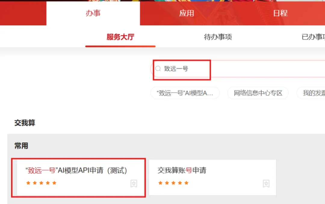 登录“交我办”APP,在流程【“致远一号”AI模型API申请(测试)】中提交申请。申请通过后,您将在邮箱及交我办消息中收到base_url和api-key。