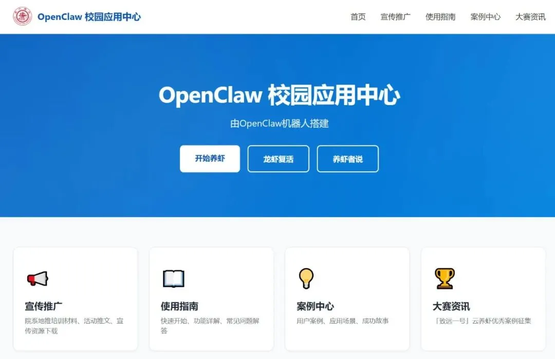 由OpenClaw机器人搭建的OpenClaw校园应用中心 claw.sjtu.edu.cn 已正式上线。网站汇集了宣传推广、使用指南、案例中心、大赛资讯等信息,是交大师生获取 OpenClaw 服务的一站式入口。