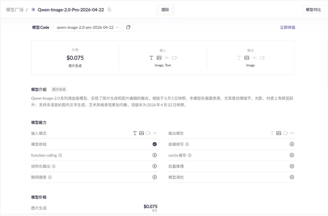 阿里云百炼平台正式上线Qwen-Image-2.0-Pro,为Qwen-Image-2.0系列「满血版」,在纹理细节、光影、材质上明显提升。模型将文生图与图像编辑整合进同一框架,用户可通过自然语言指令直接修改图片中的物体、文字、风格等元素。文字渲染能力从英文扩展至多语言支持,针对AI生图中文字乱码问题进行专项改善,支持最高2K分辨率输出,API定价0.075美元/张。