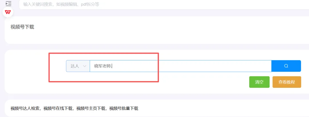 3.下面我用我的视频号:“晓军老师.”中的作品为例,给大家做一下实操的示范。在达人对话框里搜索“晓军老师.”然后点击右方的放大镜搜索图标。