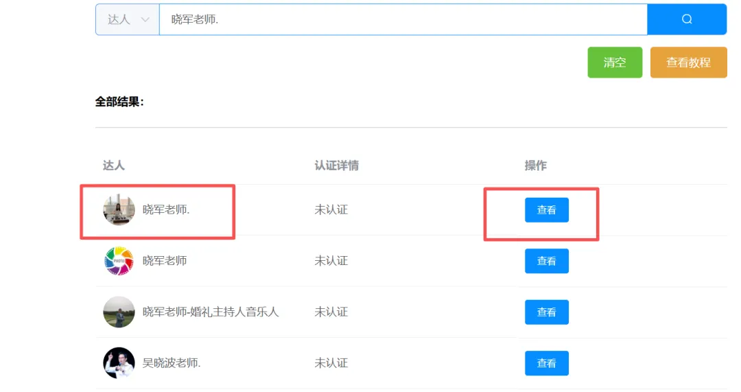4.在下面搜索到的“晓军老师.”的对话框里点击“查看”,不是“清空”旁边的“查看教程”