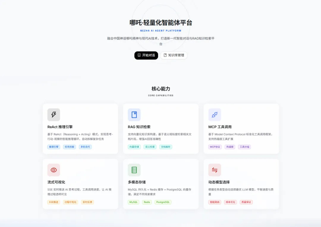 而本平台将大模型对话、RAG检索、MCP工具与ReAct推理集成在同一套前后端架构中,通过统一配置与接口管理模型与数据,大幅降低了集成与二次开发门槛,让企业能够更快速、更轻松地搭建起属于自己的AI助手。
