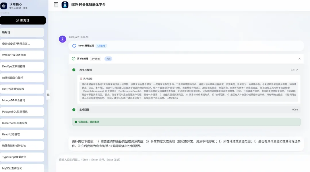 展示推理步骤、工具调用与检索状态,便于调试与演示。开发人员可以直观地看到系统的运行过程,快速定位和解决问题,同时也方便向客户展示系统的功能和优势。
